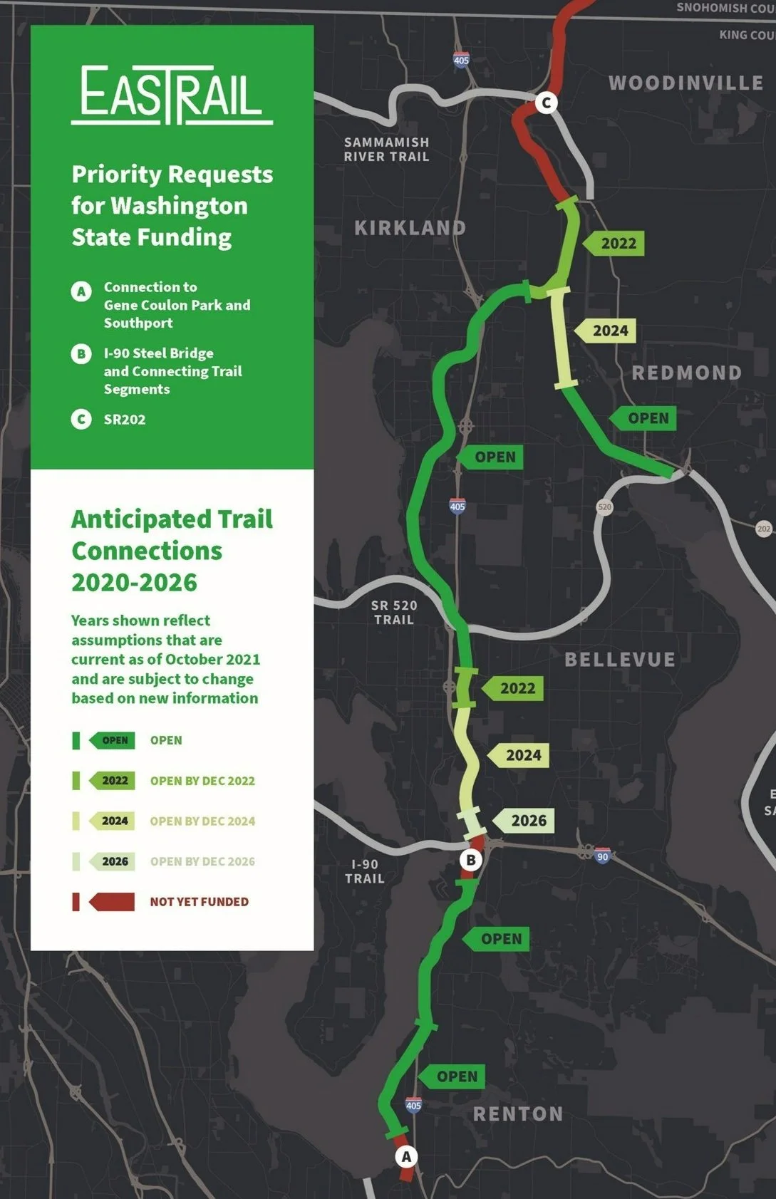 We are grateful for legislative champions who made Eastrail a priority in the 2021 Washington State legislative session, and are hopeful that the following projects will receive funding in future transportation revenue packages.